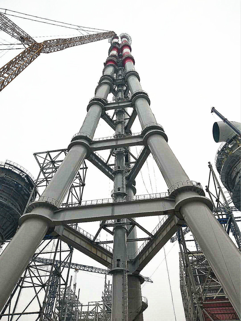 項目配套的三管自立式鋼煙囪,是國能中電引進日本三菱多管自立煙囪技術,并整合了日本鈦板貼襯技術建設而成,煙囪內徑4.5米,高度180米,分7層,總重2108t。三管自立式鋼煙囪結構合理、造型美觀。三根鋼管煙囪按正三角形布置,通過三角形鋼梁進行剛性連接,形成集束式穩定結構,每個煙囪由多個直段拼接成流線型曲線。通過整體空間結構來共同抵抗地震荷載、風荷載及其它荷載,整個煙囪結構形體規則,各向受力均勻,造型簡潔、美觀,全面融入了現代氣息和建筑美學的設計理念。自2018年8月12日開始施工建設,采用SCC9000/900噸履帶式起重機分七段進行吊裝,在參建各方的共同努力下,歷時135天,于2018年12月25日順利吊裝到頂。